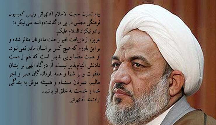 پیام تسلیت حجت الاسلام آقاتهرانی رئیس کمیسیون فرهنگی مجلس در پی درگذشت والده علی نیکزاد: