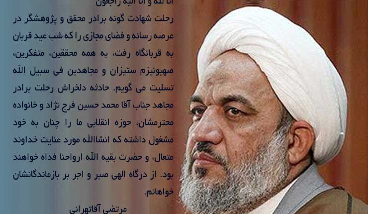 رحلت شهادت گونه برادر محقق و پژوهشگر در عرصه رسانه و فضای مجازی را که شب عید قربان به قربانگاه رفت، به همه محققین، متفکرین، صهیونیزم ستیزان و مجاهدین فی سبیل الله تسلیت می گویم. حادثه دلخراش رحلت برادر مجاهد جناب آقا محمد حسین فرج نژاد و خانواده محترمشان، حوزه انقلابی ما را چنان به خود مشغول داشته که انشاالله مورد عنایت خداوند متعال، و حضرت بقیه الله ارواحنا فداه خواهند بود. از درگاه الهی صبر و اجر بر بازماندگانشان خواهانم.