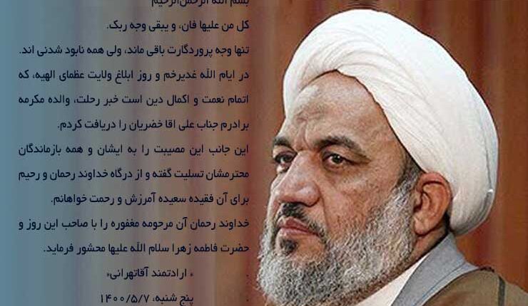 در ایام الله غدیرخم و روز ابلاغ ولایت عظمای الهیه، که اتمام نعمت و اکمال دین است خبر رحلت، والده مکرمه برادرم جناب علی اقا خضریان را دریافت کردم.
