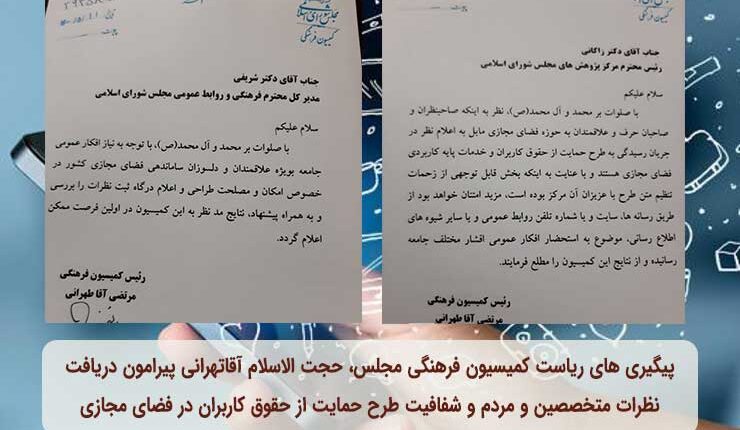 پیگیری دریافت نظر افراد در طرح حمایت اخبار در تاریخ: 16 مرداد 1400 0 پیگیری های ریاست کمیسیون فرهنگی مجلس، حجت الاسلام آقاتهرانی پیرامون دریافت نظرات متخصصین و مردم و شفافیت طرح صیانت از حقوق کاربران در فضای مجازی 0 اشتراک گذاری