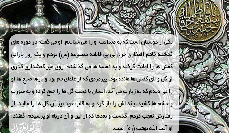 یکی از دوستان است که به صداقت او را می شناسم. او می گفت: در دوره های گذشته خادم افتخاری حرم بی بی فاطمه معصومه (س) بودم و یک روز بارانی کفش ها را امانت گرفته و به قفسه ها می گذاشتم. روی میز کفشداری قدری از گل و لای کفش ها مانده بود. پیرمردی که از علمای قم بود و بارها صبح ها او را می دیدم که به زیارت می آید، ایشان با دست گل ها را جمع کرده و به صورت و چشم ها کشید، یقه اش را باز کرد و به قلب خود نیز آن گل ها را مالید. از رفتارش تعجب کردم. گذشت و بعدها که از این و آن درباه او پرسیدم، گفتند: او آیت الله بهجت (ره) است.